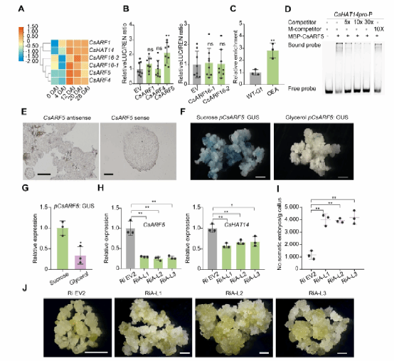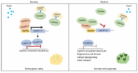 图1 CsARF5直接激活CsHAT14表达并负调控柑橘体细胞胚发生 基于以上结果提出了一个工作模型:CsARF5通过直接激活CsHAT14表达,并借助CsHAT14对CsDOF3.4的抑制作用,阻碍柑橘愈伤组织体细胞胚发生。而生长素信号抑制子CsIAA4能与CsARF5互作,这种互作减弱CsARF5对CsHAT14的激活效应,最终促进体细胞胚形成(图2)。该研究明确了生长素信号级联在甘油培养基诱导柑橘体细胞胚发生过程中的分子机制,为解决生物技术用于柑橘种质创制的再生瓶颈提供了重要理论依据。