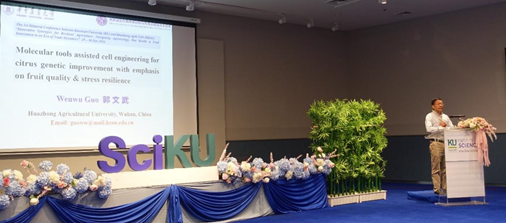 2026年1月29日至31日,华中农业大学(HZAU)与泰国农业大学(KU)在曼谷召开首届双边学术研讨会(The 1st Bilateral Conference between Kasetsart University and Huazhong Agricultural University)。我校柑橘研究所郭文武、徐娟、伍小萌3位教授与正在泰国农业大学进行短期学习交流的园林学院师生共39人一同参会。会议主题为“创新型协同增效,共建韧性农业”(Innovative Synergies for Resilient Agriculture: Navigating Agroecology, One Health, and Food Innovation in an Era of Trade Dynamics)。 会议包含2个主旨报告和24个分会场报告,双方研究人员在园艺、水产、食品科学等领域展开了深入交流。会上,郭文武教授做主旨报告“Molecular tools assisted cell engineering for citrus genetic improvement with emphasis on fruit quality and stress resilience”,徐娟教授、伍小萌教授分别做“Decoding the aromatic and healthy character of citrus via molecular sensory approach”、“Citrus asexual reproduction mechanisms and seedless breeding”分组报告。